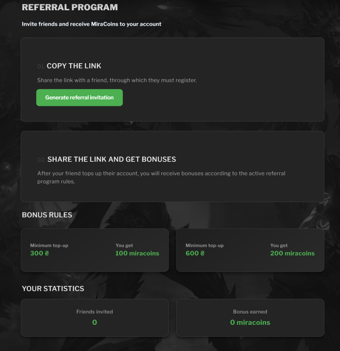 After the invited user tops up their account, the person who invited them receives MiraCoins, the platform’s internal currency.